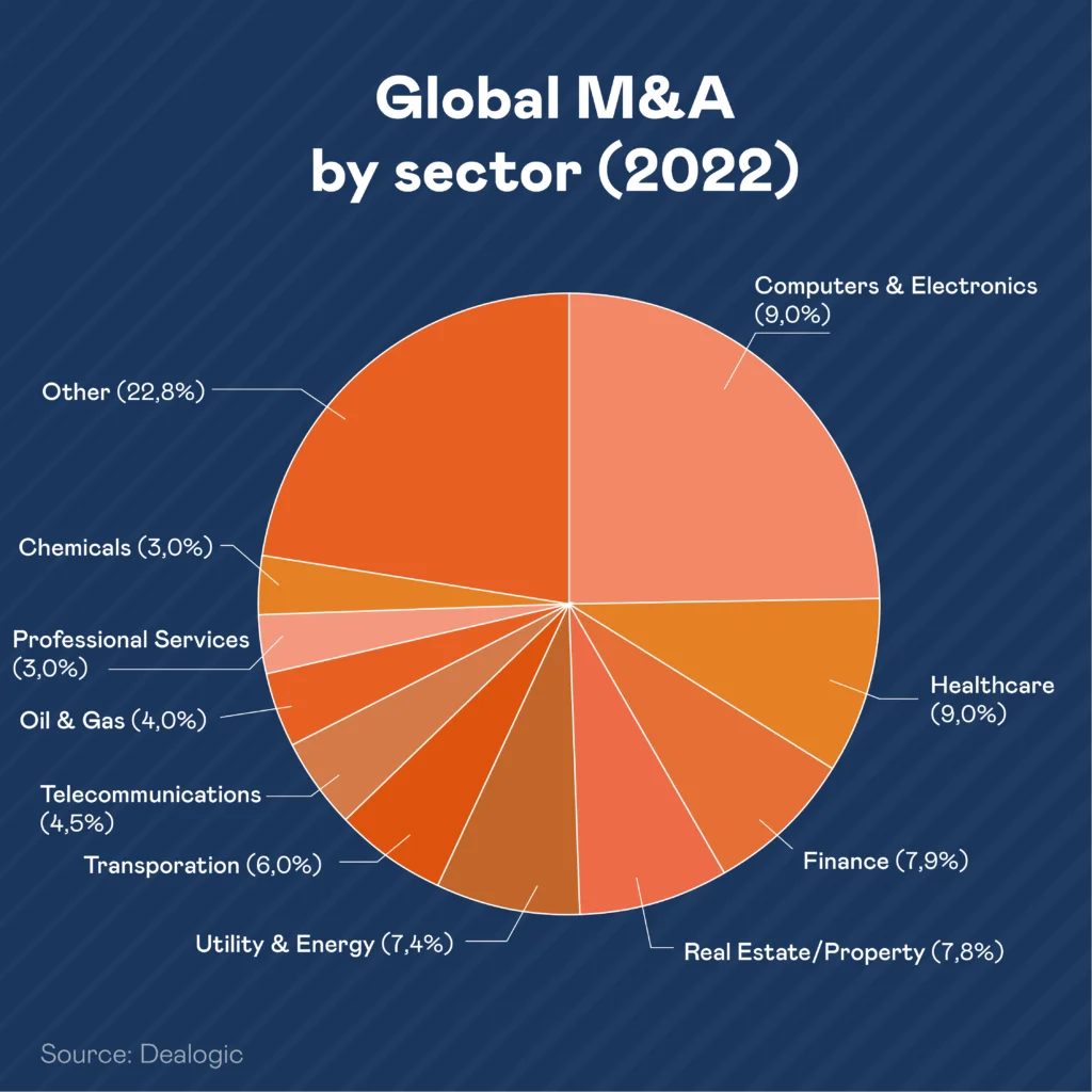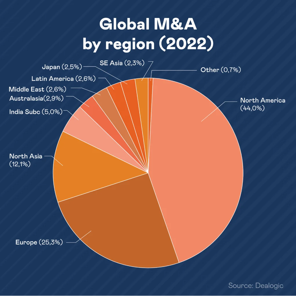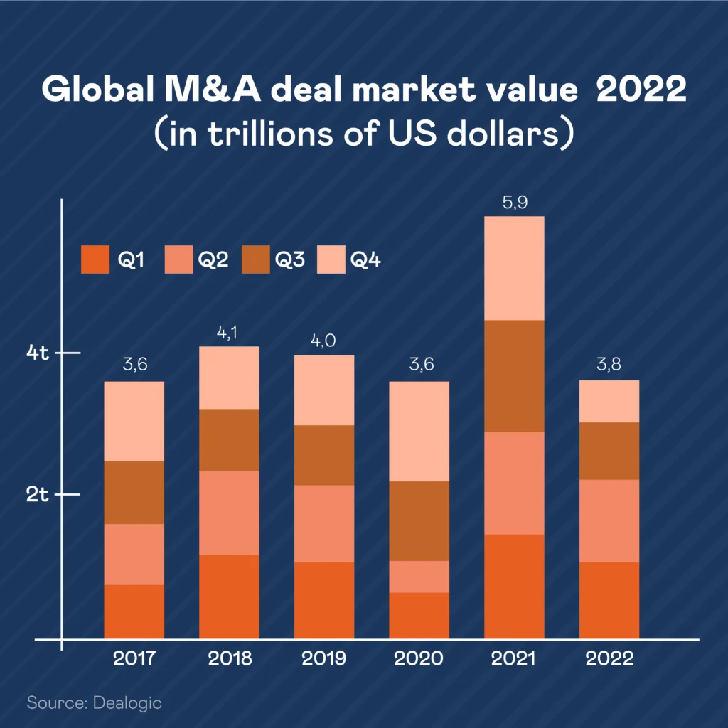 M&A-активність почала різко знижуватися з травня минулого року, зокрема, й через рецесію світових економік. У 2 півріччі 2022 обсяг угод впав на 40% (до $1,364) у порівнянні із першим півріччям цього року, коли обсяг угод складав $2,256 трлн.